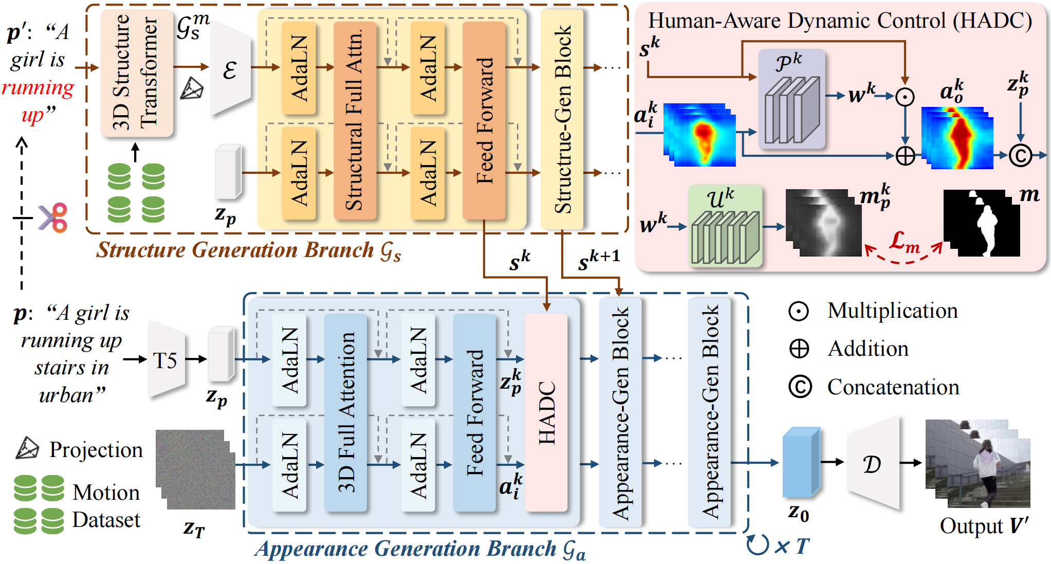 Overview of the proposed MoSA. Given a text prompt, we first employ a 3D structure transformer to generate a structure sequence, which is subsequently encoded as structural features to guide the appearance generation. To further enhance motion consistency, we introduce human-aware dynamic control modules. For brevity, the Gate modules in blocks have been omitted.