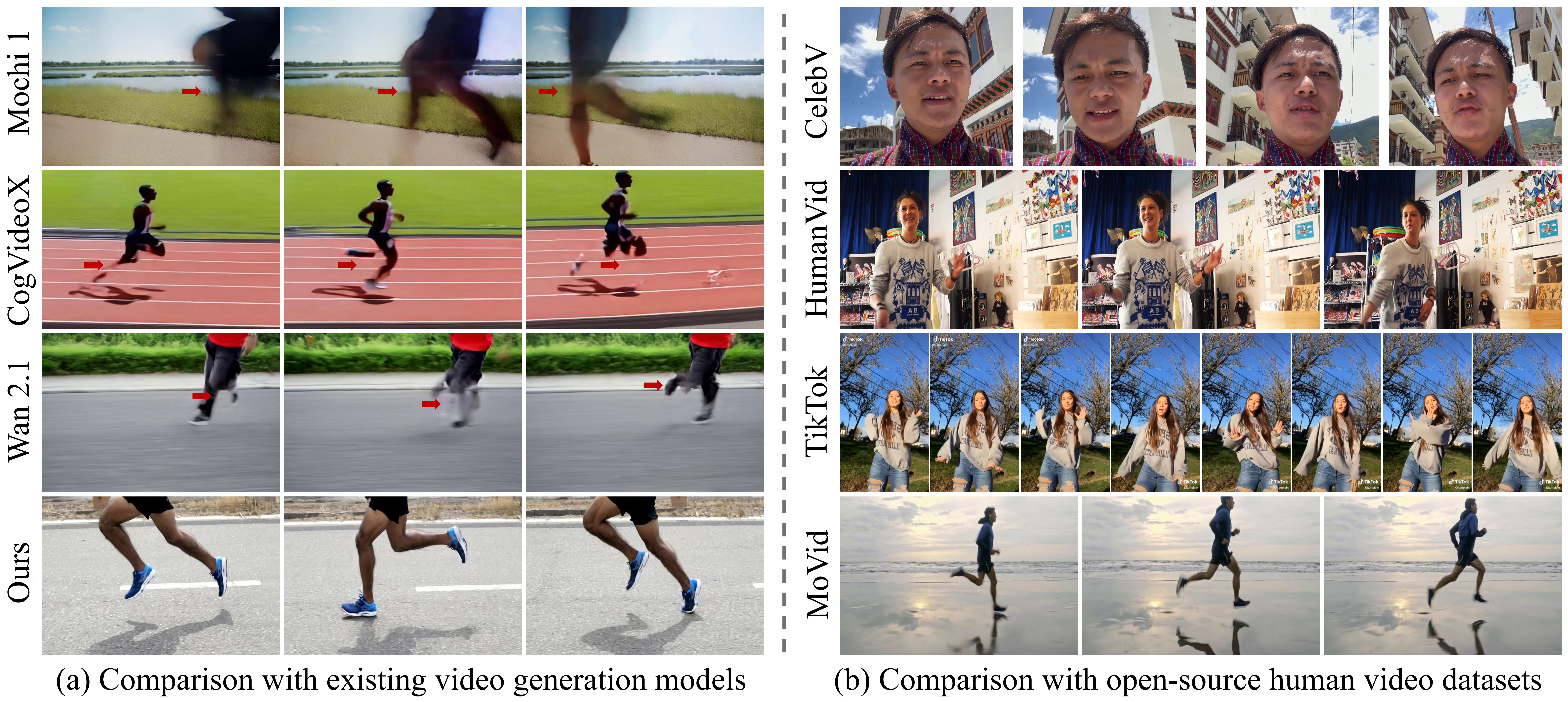 Illustration of the motivation. (a) shows sampled frames from videos generated with the prompt “running”, where existing works struggle to generate human videos with reasonable structures. (b) compares existing human video datasets and our Movid, where existing datasets mostly focus on facial or upper-body regions, or consist of vertically oriented dance videos. More samples Movid are provided in supplementary materials.